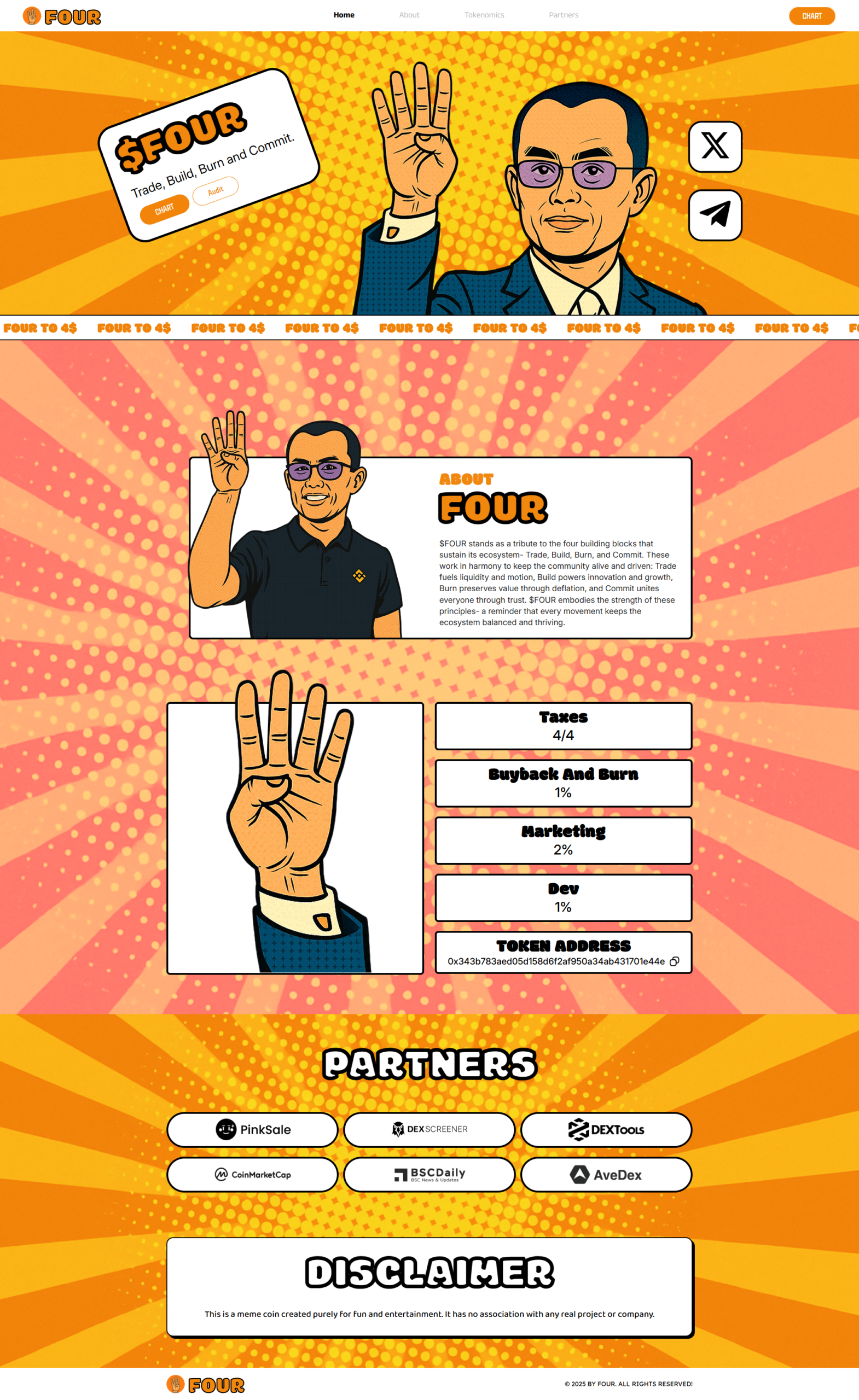 $FOUR is a community-driven meme coin built on four core principles: Trade, Build, Burn, and Commit. We designed the website maintaining their theme, clean layout & bold visual